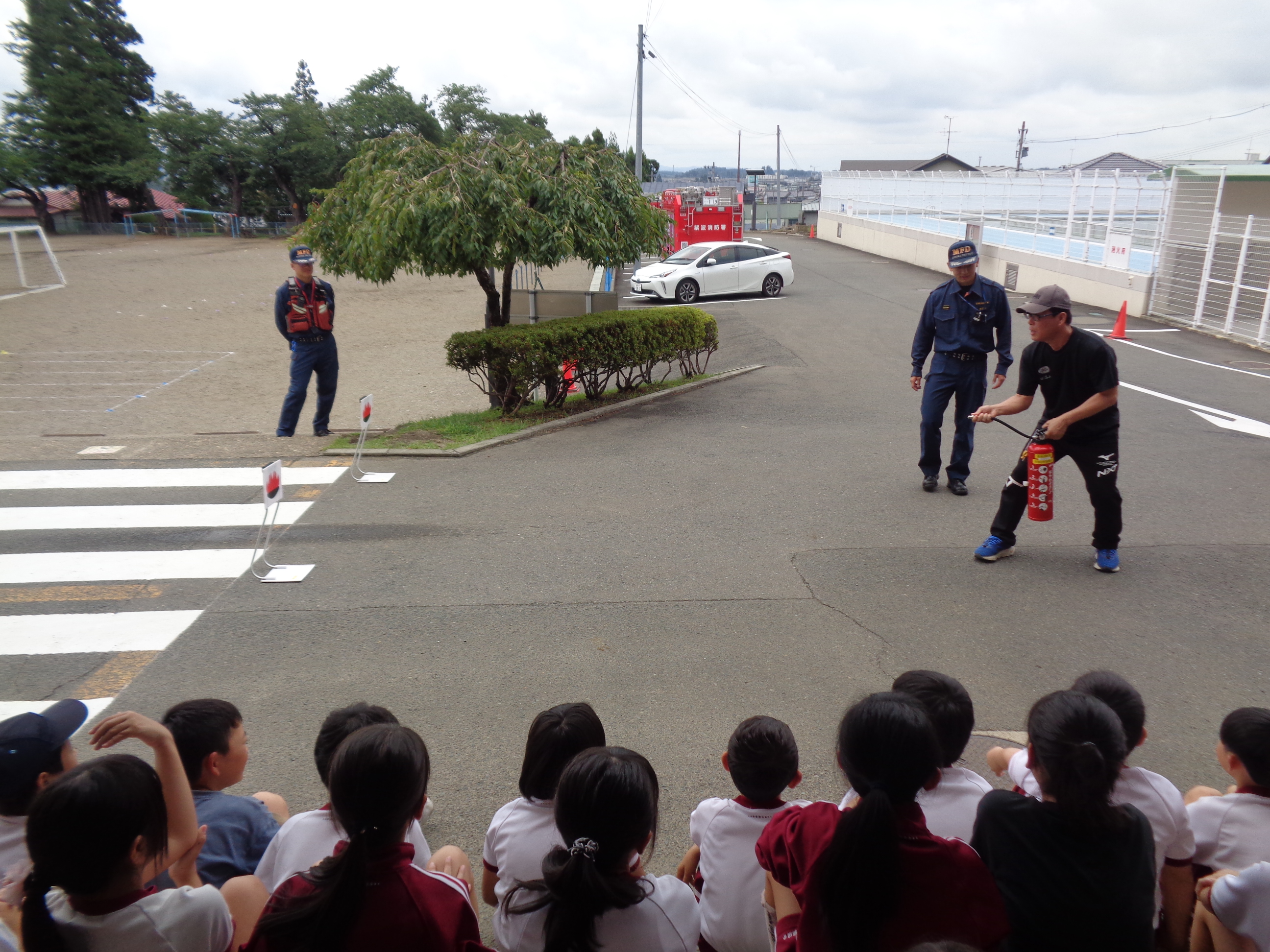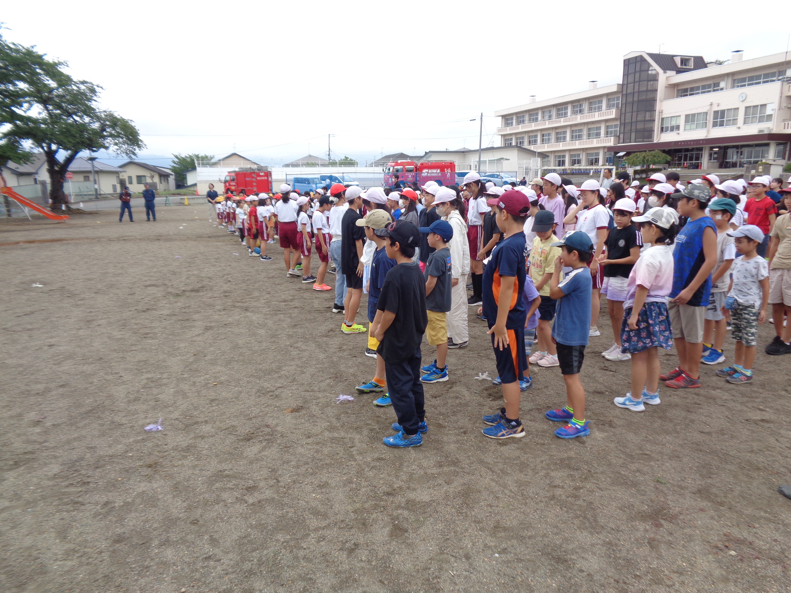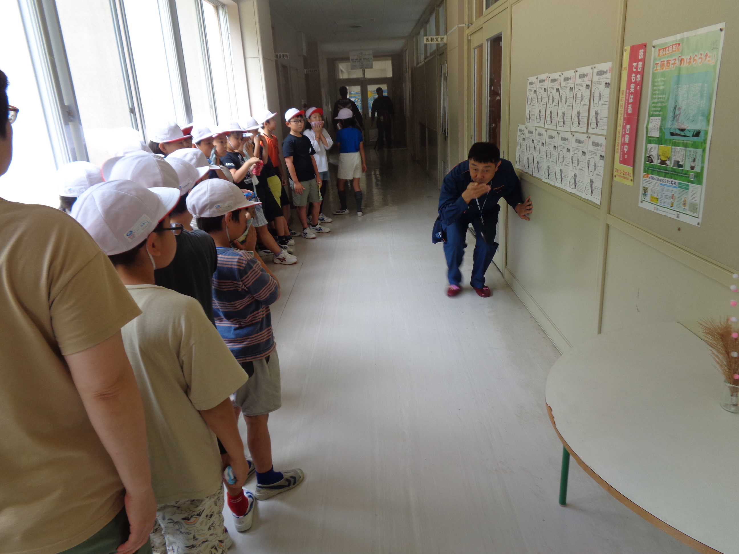 9月5日(金)に、避難訓練が行われました。今回は、休み時間に地震が起きた場合どのように身を守るか、さらに火災が起きた場合にどのように避難するかを訓練しました。避難訓練の事前指導は各学級で行われていましたが、避難訓練の日時については予告なしで行いました。それぞれの場所で放送を聞き、速やかに非難することができました。避難訓練後は、3・4年生が消火訓練見学、煙体験を行いました。